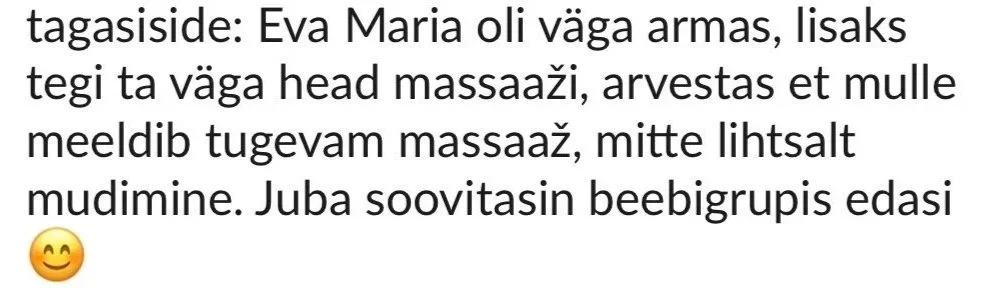 Olen kutsetunnistusega massöör (tase 5) ning minu eesmärk on aidata Sul saavutada parem enesetunne läbi teadliku ja hooliva puudutuse.